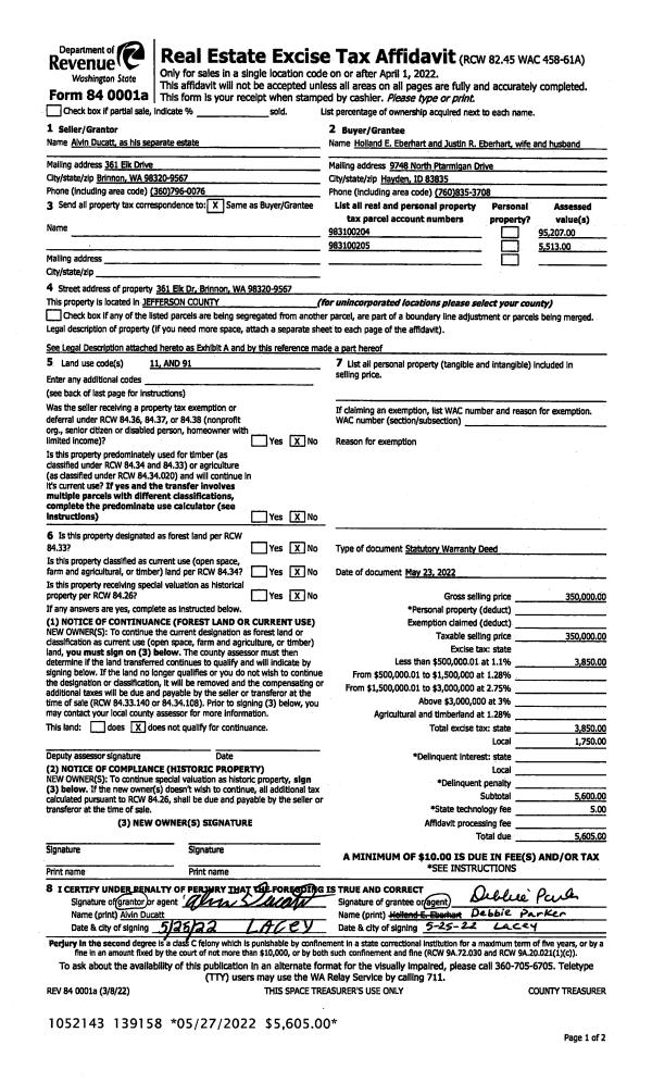 | 6 | 09/21/1995 | SWD | Statutory Warranty Deed | GASSON, CLETUS & DOROTHY | EISELT, RAYMOND & PHYLLIS | 0 | 0 | $340,000.00 | 77910 | 0 |