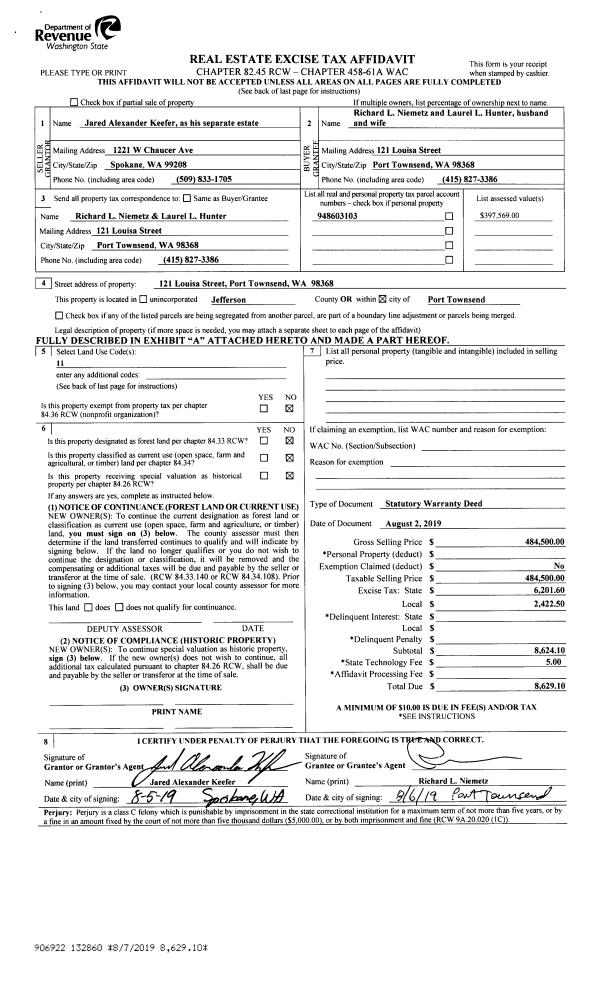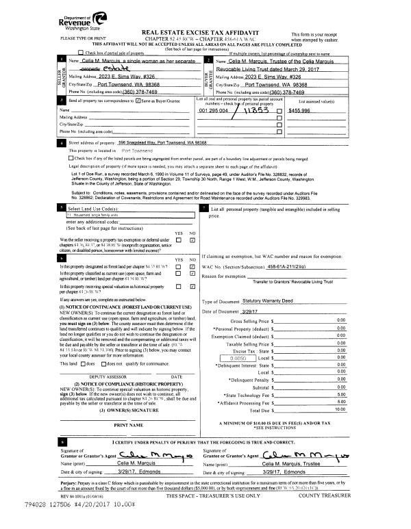 | 4 | 01/17/2018 | SWD | Statutory Warranty Deed | IRINA A EERO | MARK BASEL | | | $20,000.00 | 129437 | |