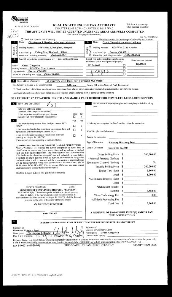 | 1 | 10/24/2016 | SWD | Statutory Warranty Deed | JAMES A RUNDQUIST | JEFFERSON COUNTY | | | $10,000.00 | 126559 | |