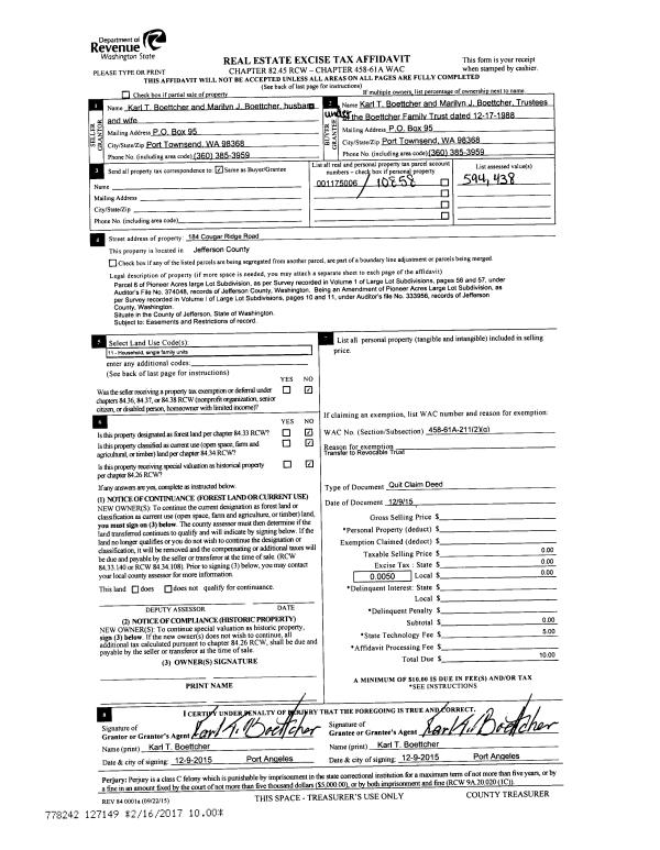 | Mailing Address: | 541 SEAMOUNT DR BRINNON, WA 98320-9675 | % Ownership: | 100.0000000000% |