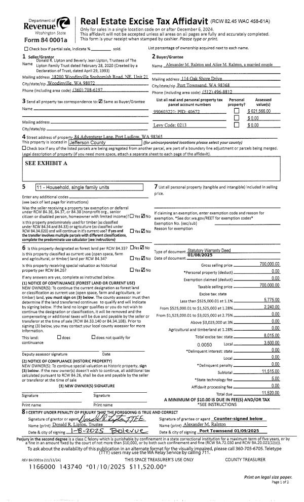 | Mailing Address: | 2456 SEAVIEW DR PORT TOWNSEND, WA 98368-1013 | % Ownership: | 100.0000000000% |