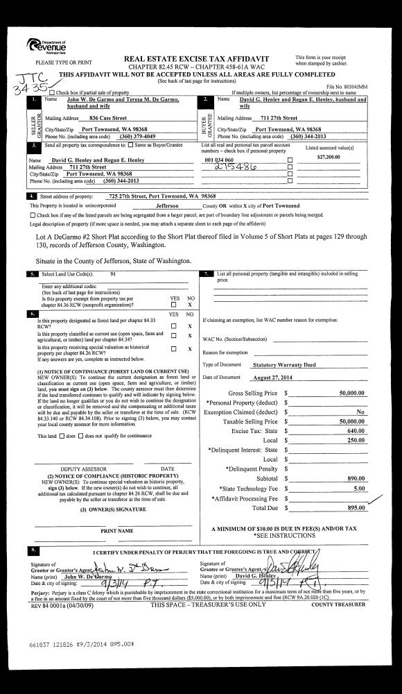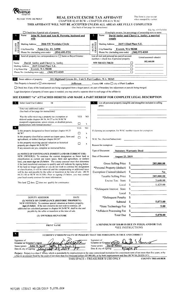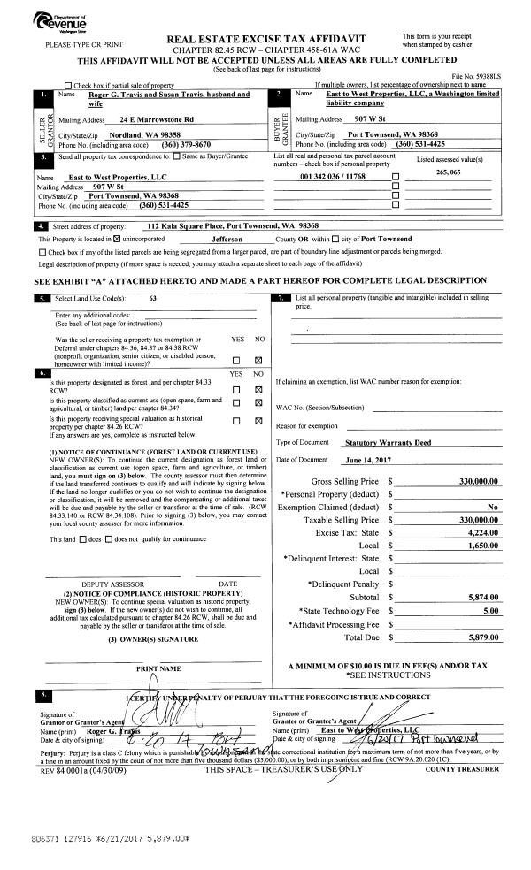 | 3 | 09/20/2018 | SWD | Statutory Warranty Deed | AMY M JORDAN | CITY OF PORT TOWNSEND | | | $2,000.00 | 131057 | |