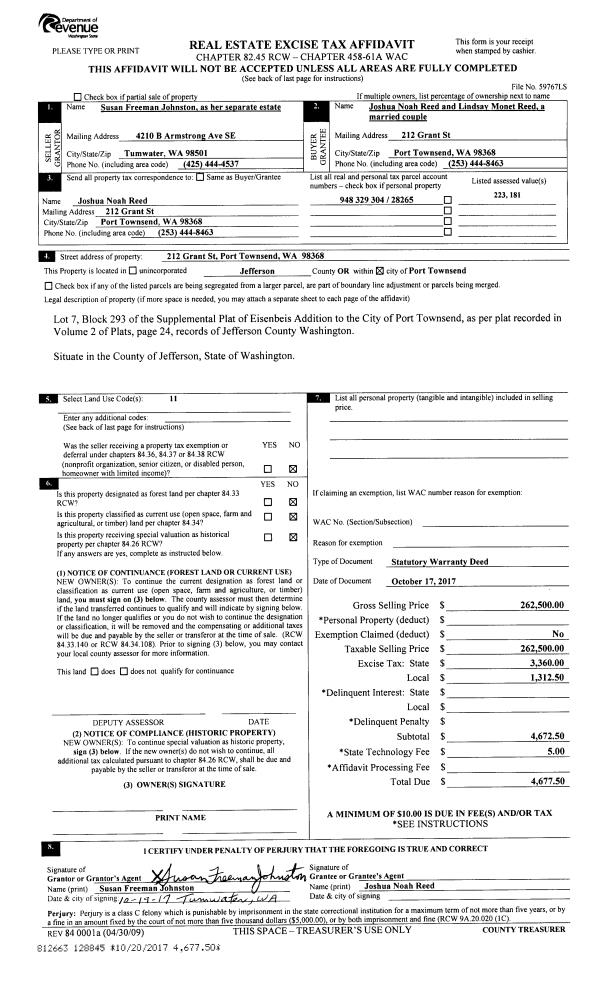 | 4 | 12/23/2005 | SWD | Statutory Warranty Deed | SHARICK, ED/DARLENE J | PORT HADLOCK/K.S.C. | 0 | 0 | $447,000.00 | 105734 | 0 |