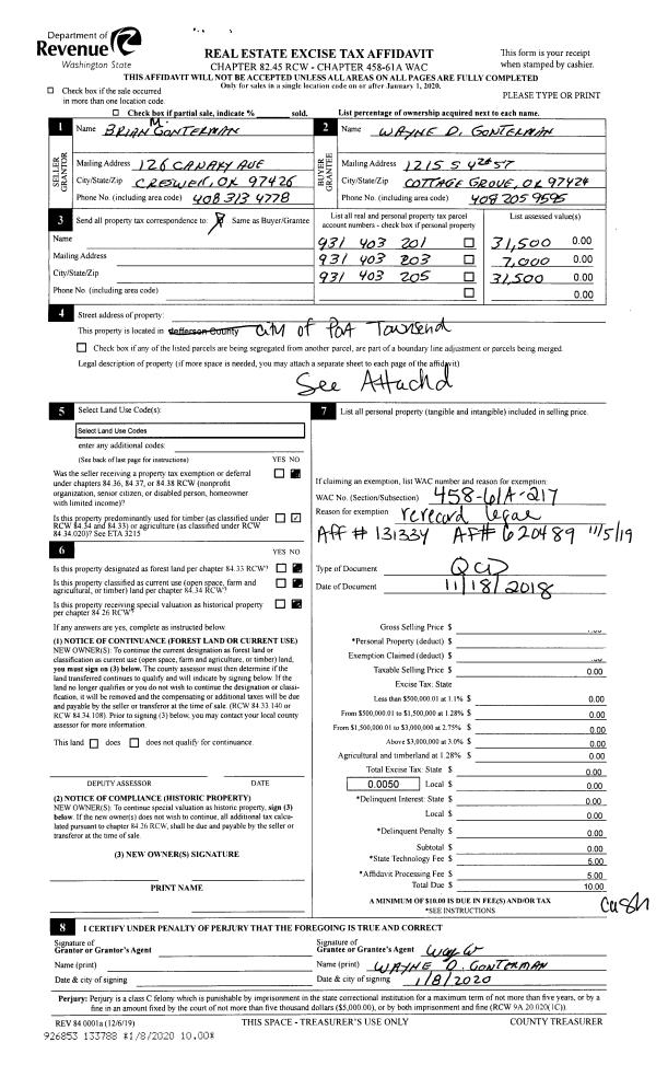 | 4 | 05/23/2006 | SWD | Statutory Warranty Deed | PORT HADLOCK/K S C LLC A | BOEKHOFF, MICHAEL D/CINDY D | | | $95,000.00 | 106747 | 0 |