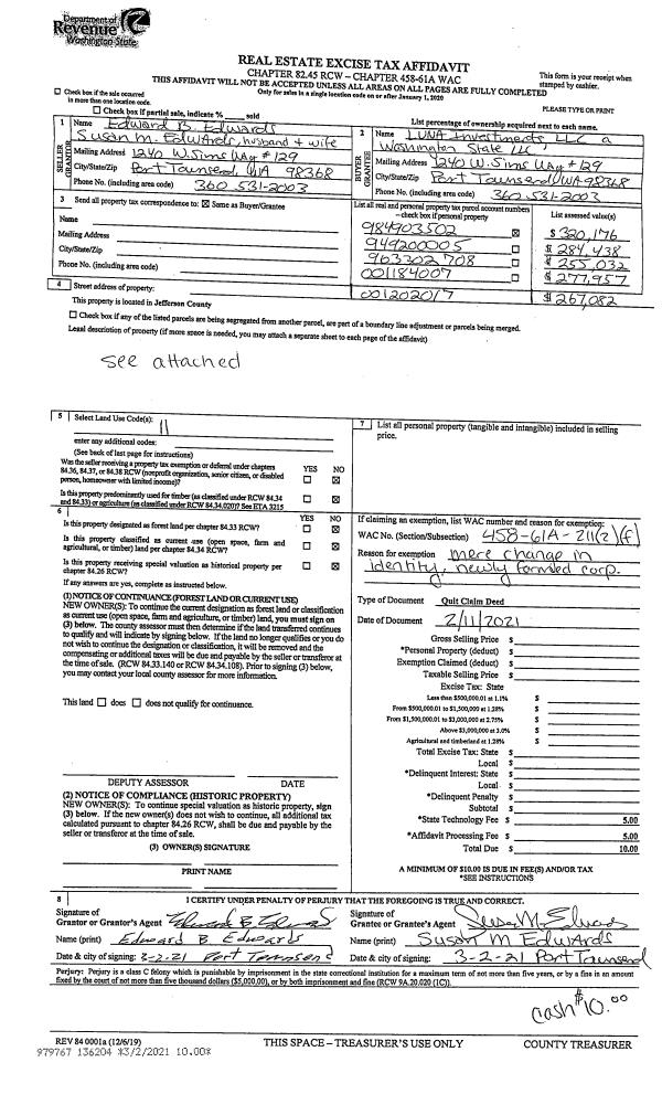 | 2 | 10/15/2004 | SWD | Statutory Warranty Deed | PORT HADLOCK KSC, LLC | SUMPTER, LAWRENCE/TERESA | 0 | 0 | $160,000.00 | 101889 | 0 |