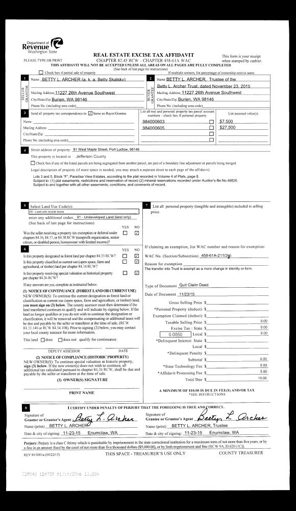 | Mailing Address: | 320 TALA SHORE DR PORT LUDLOW, WA 98365 | % Ownership: | 100.0000000000% |
