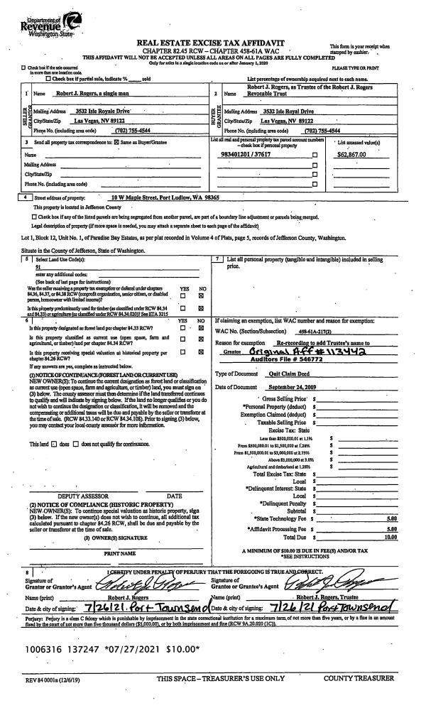 | Mailing Address: | 37 MCKENZIE LN PORT LUDLOW, WA 98365-9233 | % Ownership: | 100.0000000000% |