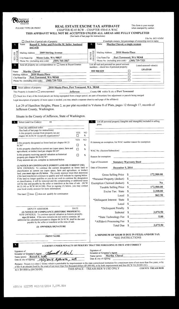 | 2 | 11/05/2013 | SWD | Statutory Warranty Deed | PATRICIA B CHASE TRUSTEE | NANCE A JOHNSON | | | $220,000.00 | 120256 | |