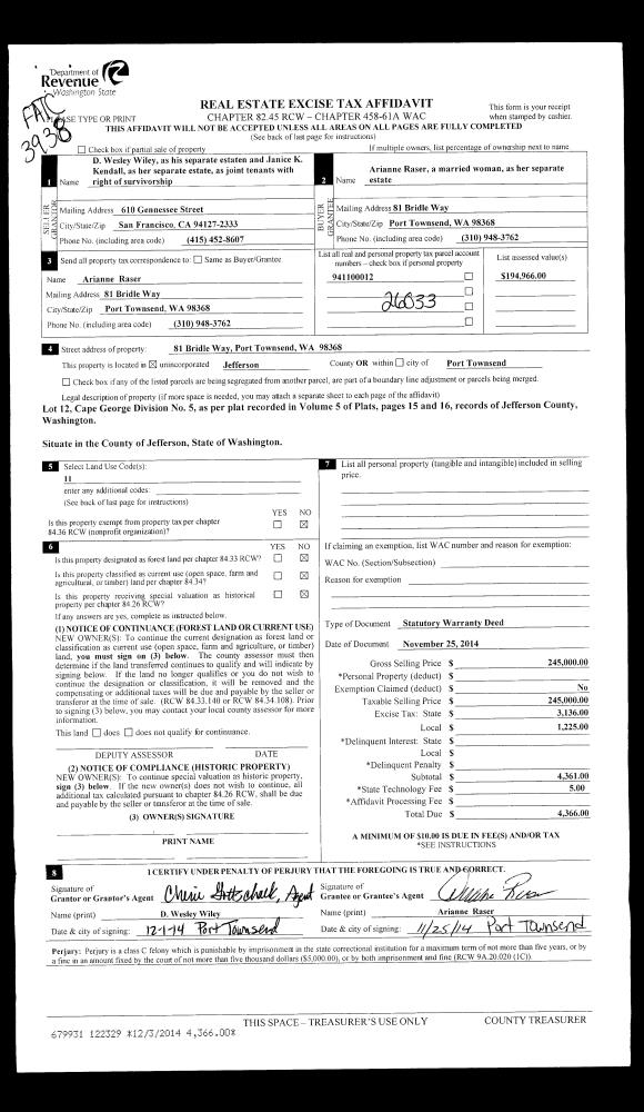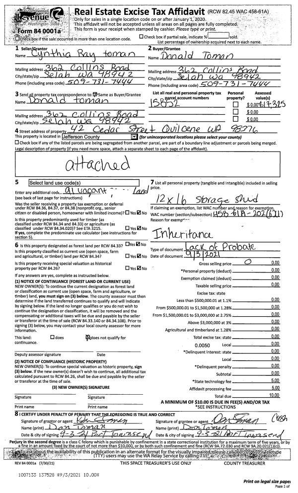 | Mailing Address: | WALTER DAVIES-OWENS 44 LEIGHBROOK LN PORT LUDLOW, WA 98365-8745 | % Ownership: | 100.0000000000% |