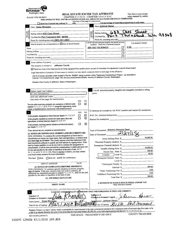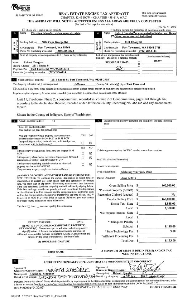 | 1 | 11/13/2020 | SWD | Statutory Warranty Deed | TERMINATION POINT PROPERTIES LLC | MICHAEL & PAMELA TRASK | | | $40,000.00 | 135646 | |