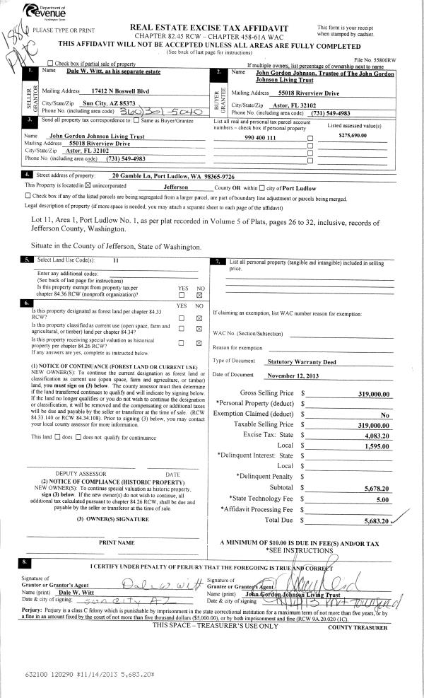 | 2 | 02/28/2014 | QCD | Quit Claim Deed | RUSSEL J TRASK TRUSTEE | TERMINATION POINT PROPERTIES LLC | | | | 120806 | |