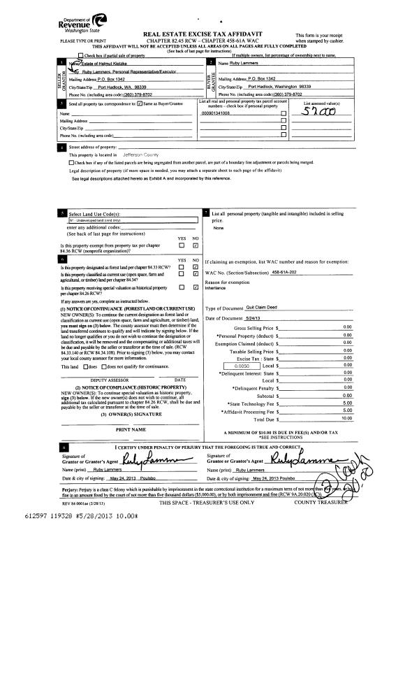 | 2 | 02/28/2014 | QCD | Quit Claim Deed | RUSSEL J TRASK TRUSTEE | TERMINATION POINT PROPERTIES LLC | | | | 120806 | |