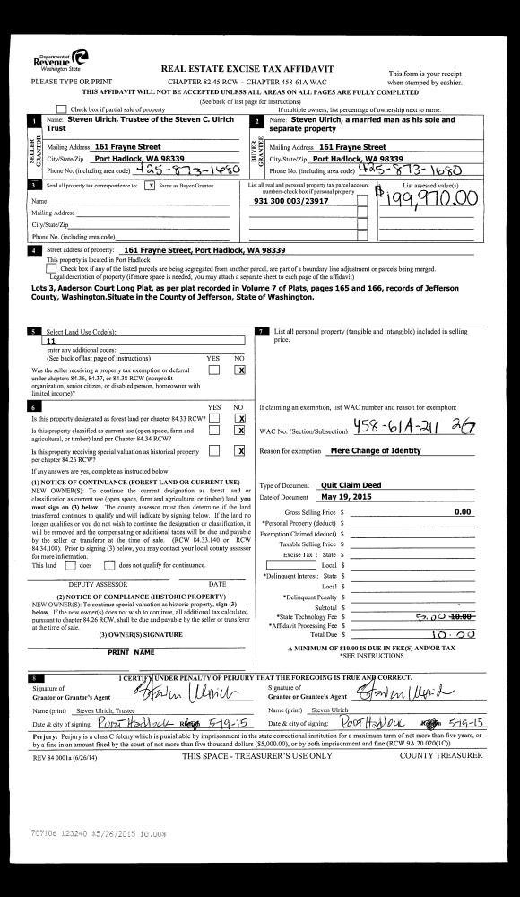 | Mailing Address: | 13 SEA VISTA PL PORT LUDLOW, WA 98365-9586 | % Ownership: | 100.0000000000% |