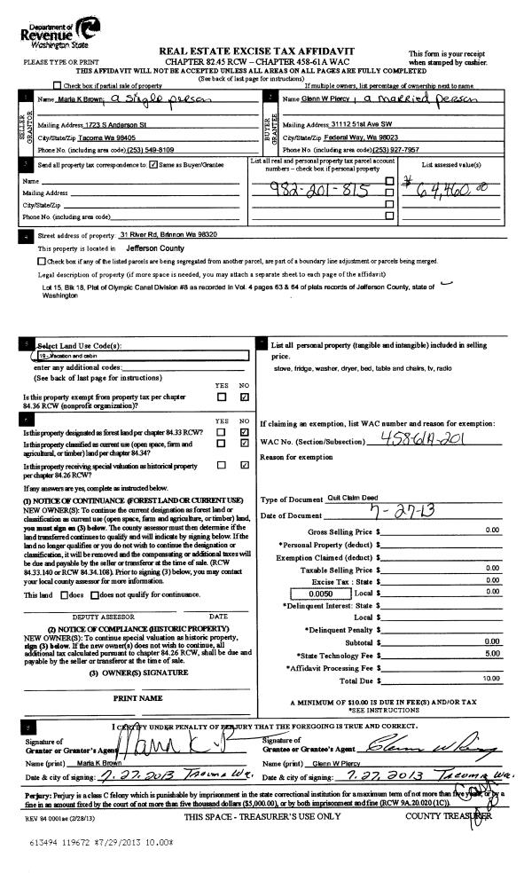 | 3 | 09/19/2014 | QCD | Quit Claim Deed | ROBERT M & CINDY L ERICKSON | CONNIE I DALRYMPLE | | | $0.00 | 122002 | |