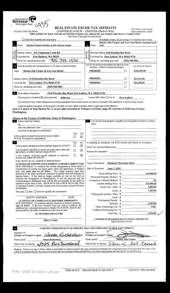 | Mailing Address: | PEGGY L FLENTIE 83 SEAWAY PL PORT LUDLOW, WA 98365 | % Ownership: | 100.0000000000% |