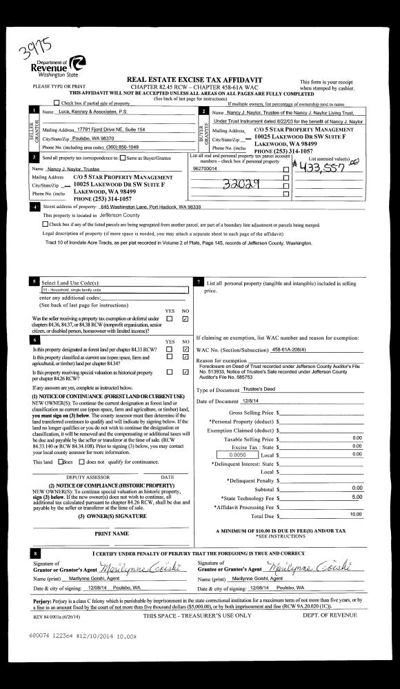 | Mailing Address: | 2285 TOWNE POINT AVE PORT TOWNSEND, WA 98368-7317 | % Ownership: | 100.0000000000% |