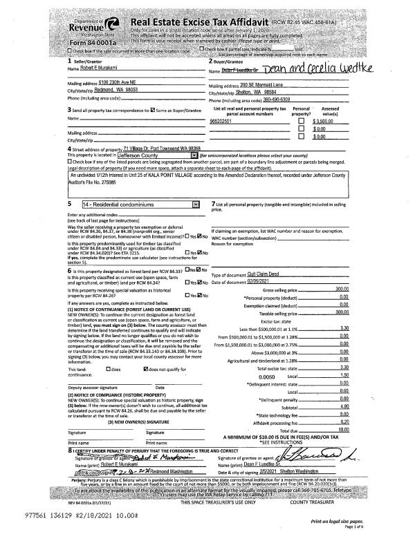 | 7 | 08/12/1994 | SWD | Statutory Warranty Deed | CLARK, LAURA B | QUILCENE INN INC | 0 | 0 | $84,000.00 | 74937 | 0 |