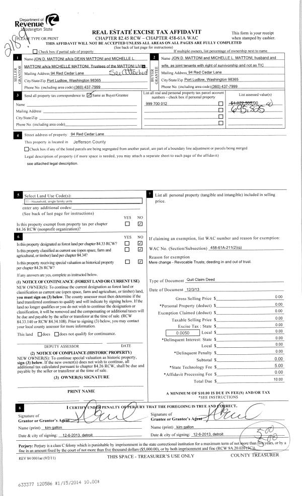 | 1 | 12/02/2014 | QCD | Quit Claim Deed | INGRAM M & MARTHA M FLEMING | FLEMING REVOCABLE LIVING TRUST | | | | 122331 | |