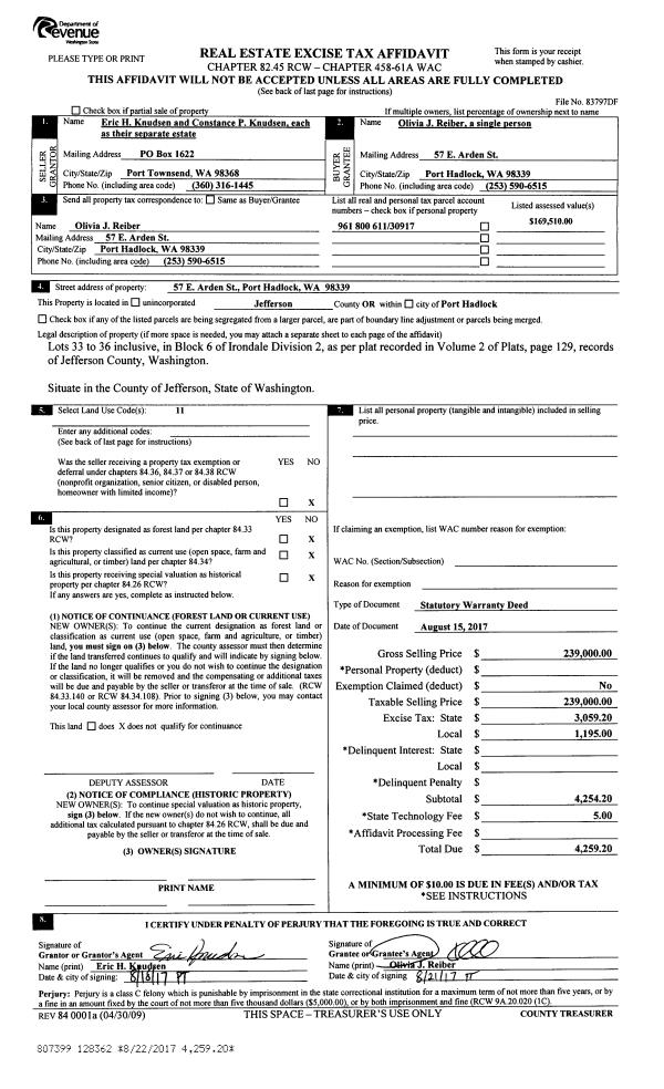 | Mailing Address: | JTWROS 543 PARKRIDGE DR PORT TOWNSEND, WA 98368-2599 | % Ownership: | 100.0000000000% |